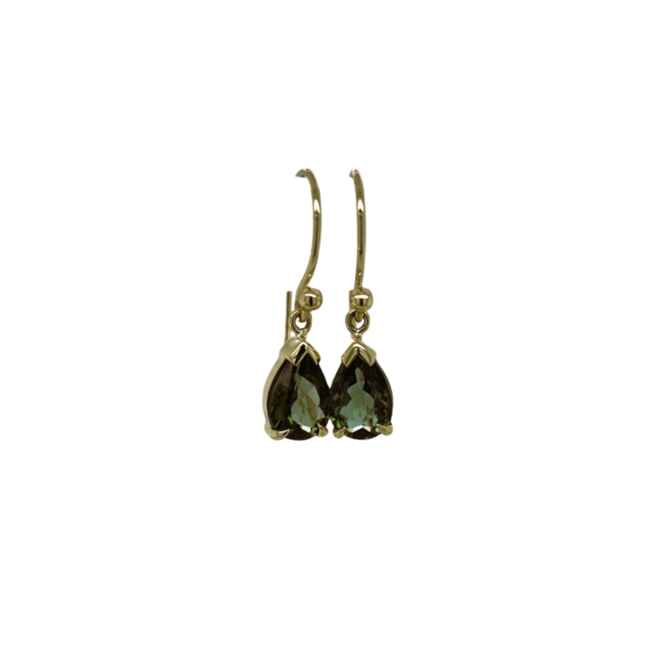 9ct yellow gold pear shaped tourmaline drop earrings on shepherd hooks.