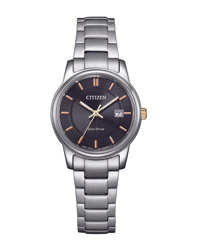 Citizen Ladies Eco-Drive Dress Watch EW2317-76EThis watch embodies practical efficiency with outstanding reliability. It offers sought-after accuracy, staying precise within 15 seconds each month. Powered by Eco-Drive technology, it eliminates the need for batteries or charging cables. The watch showcases a deep black dial with a date display, clear markings, and a robust stainless steel construction, seamlessly merging form and function.