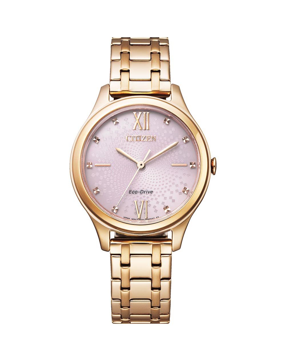 Make room in your watch collection for this stunning timepiece. A fresh staple to your every day watch wearing with clean lines and simplistic detailing. Featuring a rose gold tone dial, rose gold stainless steel case and bracelet. Powered by Eco-Drive technology, never needing a battery.