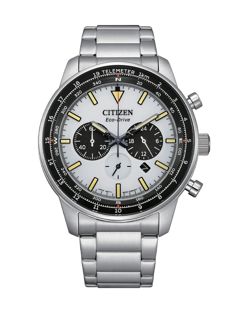 An extension of the Chronograph range, this multigenerational chronograph is your perfect accessible pilot timepiece. Featuring an array of aviation level functionality such as Eco-Drive technology ensuring your watch never loses power, a thin bezel with a wide dial for better visibility and luminous markings. Armed with base 30 pulsations for high accuracy heart rate count. This method is one which is used medically to measure heart rates both quickly and accurately. Start counting the heart rate for 30 beats from the 12 hour marker. When you reach 30, where the second hand points is the heart rate. Secondary functions include date, 12/24 hour time, water resistance to WR100/10 Bar, ideal for swimming and snorkelling. This model has definite classic appeal with a dress edge found in the stainless steel bracelet style band, pearl white dial and stainless steel case and bezel, topped with a mineral crystal glass.