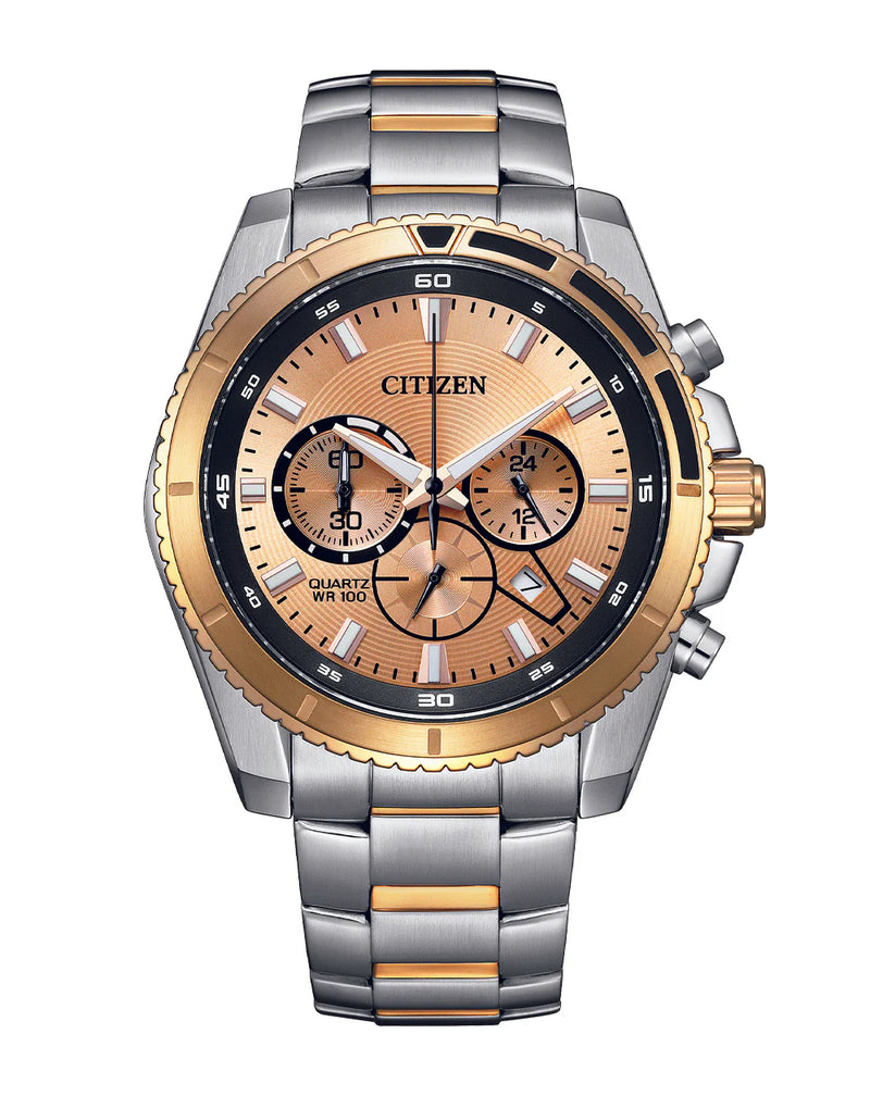 The Citizen Quartz Men’s Sports Chronograph is the perfect blend of style, functionality, and precision. Equipped with a 1/1 second chronograph and 60-minute timing, this watch ensures you're always on top of your game. With its 24-hour time display and convenient date function, it’s built for those who value both form and performance. Crafted with a sleek stainless steel case and bracelet, complemented by a striking peach dial, this timepiece isn’t just a watch – it’s a statement. The sophisticated design captures attention, making it ideal for both casual and formal occasions. Powered by Citizen’s cutting-edge Japanese Quartz movement, this chronograph promises unmatched accuracy and reliability, ensuring you can rely on it every minute of the day. Whether you're out on an adventure or in a business meeting, the Citizen Quartz Men’s Sports Chronograph keeps you punctual, stylish, and ahead of the curve.