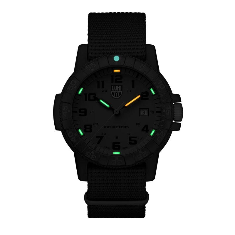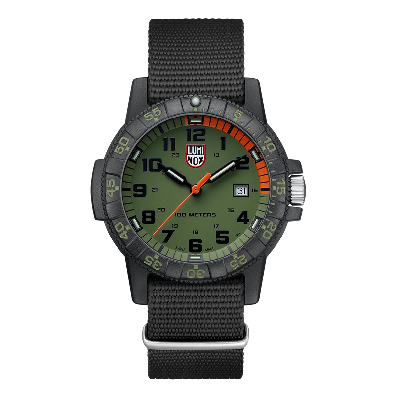 The Leatherback Sea Turtle Giant Turtle outdoor watch features an impressive 44 mm CARBONOX™ case and water resistance up to 100 meters. The green dial with orange accents provides highlights. Its proven Luminox Light Technology lighting system guarantees self-powered readability in the night. "Always Visible" for 25 years.